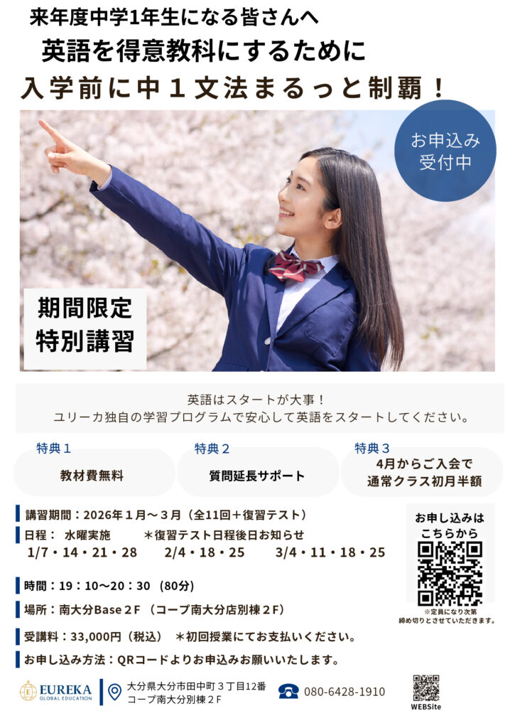 この冬、ユリーカでは来年度中学1年生になるお子さん向けに、期間限定の特別講習を行います。
